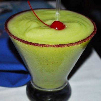 Place approximately 1/3 of a very ripe avocado in a blender. Top with ice (measured with the glass you’re going to be serving in) and add 2 parts tequila, 1 part Midori liquor, 2 parts lime juice, 1 part simple syrup made with agave nectar. Blend until smooth and serve in a salt rimmed glass