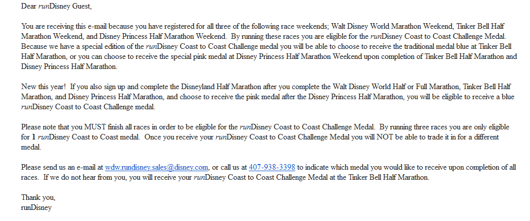 runDisney heard, and they responed. Here’s the official email sent to participants registered for the first 3 eligible races of 2014.