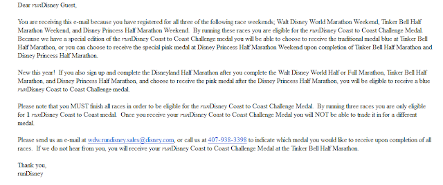 A new email released today sheds light on the confusing issue of a runner who registered for the Walt Disney World Marathon or Half Marathon, Tinker Bell, and the Princess Half. Historically, you would recieve the Coast to Coast medal after completing one East coast race and one West coast race. In this case, you would receive your medal after the Tinker Bell Half.