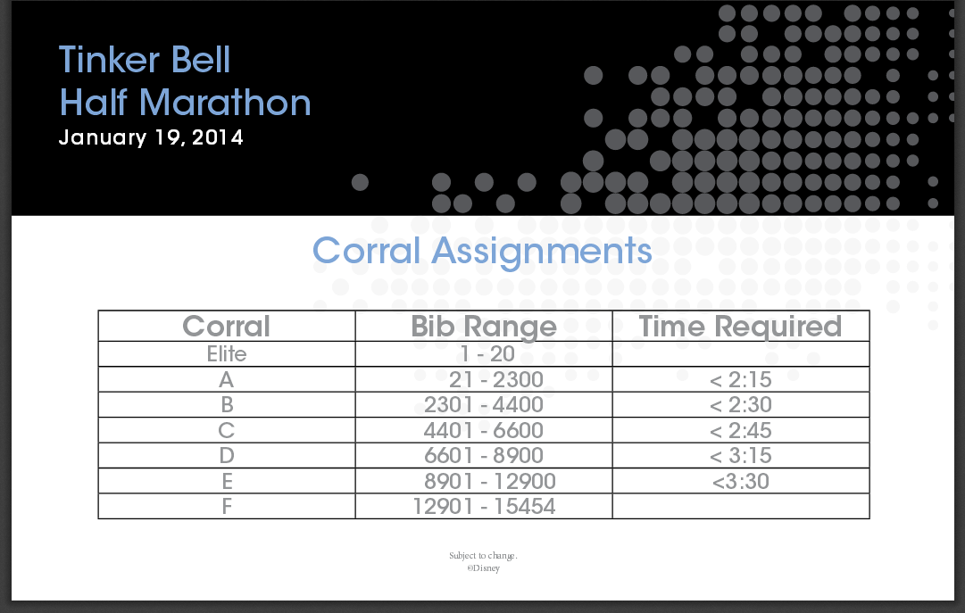 Corrals: I’m already hearing that these are pretty messed up. People with 2:30 proof of times submitted have been placed in F corral. There’s going to be some unhappy Tinkers calling runDisney this morning! As a reminder, the rules have changed: there will be NO changes unless there was something at error on runDisney’s end. I have seen reports of changes made to Marathon weekend corrals based on proven mistakes (ie, runDisney emailed you saying your Proof of Time was accepted but you still end up in last corral with people offering no proof of time.)
