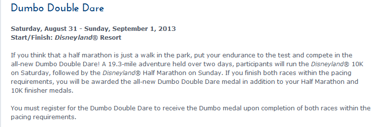 Dumbo Dare is the first Disney 19.3 mile challenge ever. It was announced in December 2012, with early registration starting at the Marathon Weekend expo. Adding a 10K to the weekend caused quite a bit of excitement with the Disney runner community. So much so, the event sold out in under an hour when it was finally open to the public for registration. What it entails is simple: